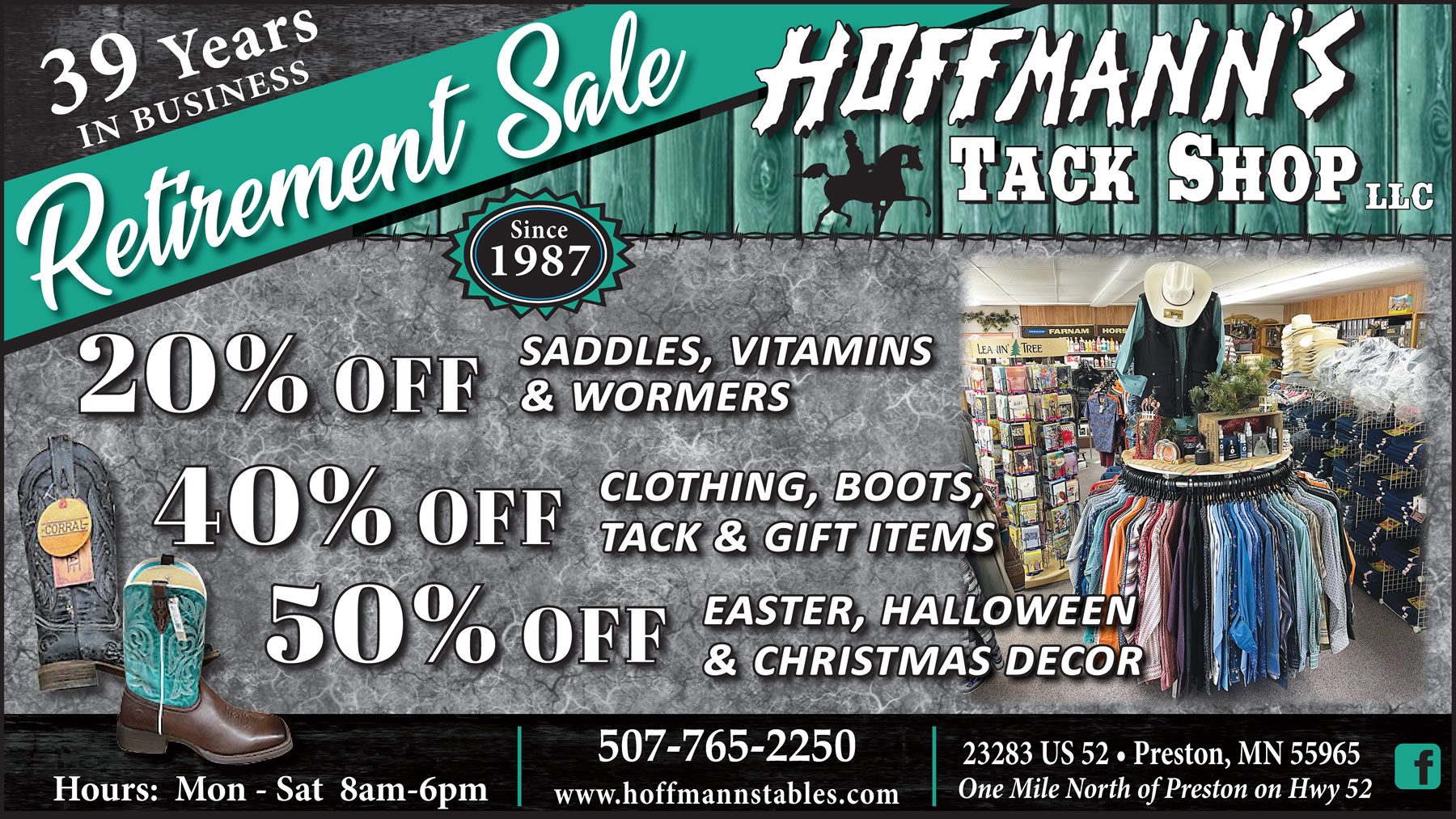 Here in Preston, Minnesota, stores that do it all are few and far between. That’s why we’re proud to offer just about anything the community needs for their horses, their closets, or their stables. From Western and English clothing and equipment to boots and clothing for the entire family (not just horse owners!), anything you need, we’re proud to help you find it.